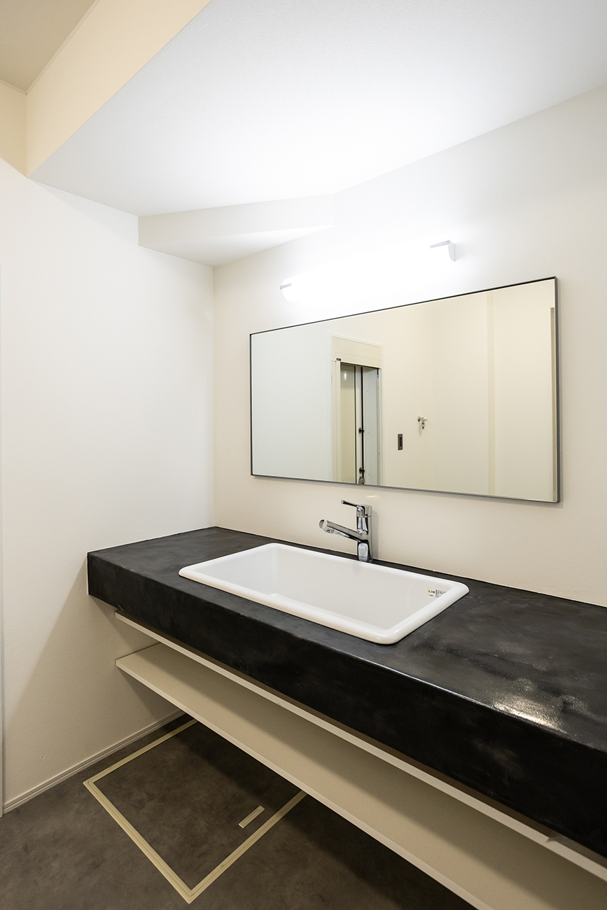 空間全体をすっきりとまとめるために設計された、造作タイプの洗面カウンター。天板には重厚感のあるマットブラック調の仕上げを採用し、インテリアとしての存在感と機能性を両立。白のボウルとのコントラストが、洗練された印象を生み出しています。