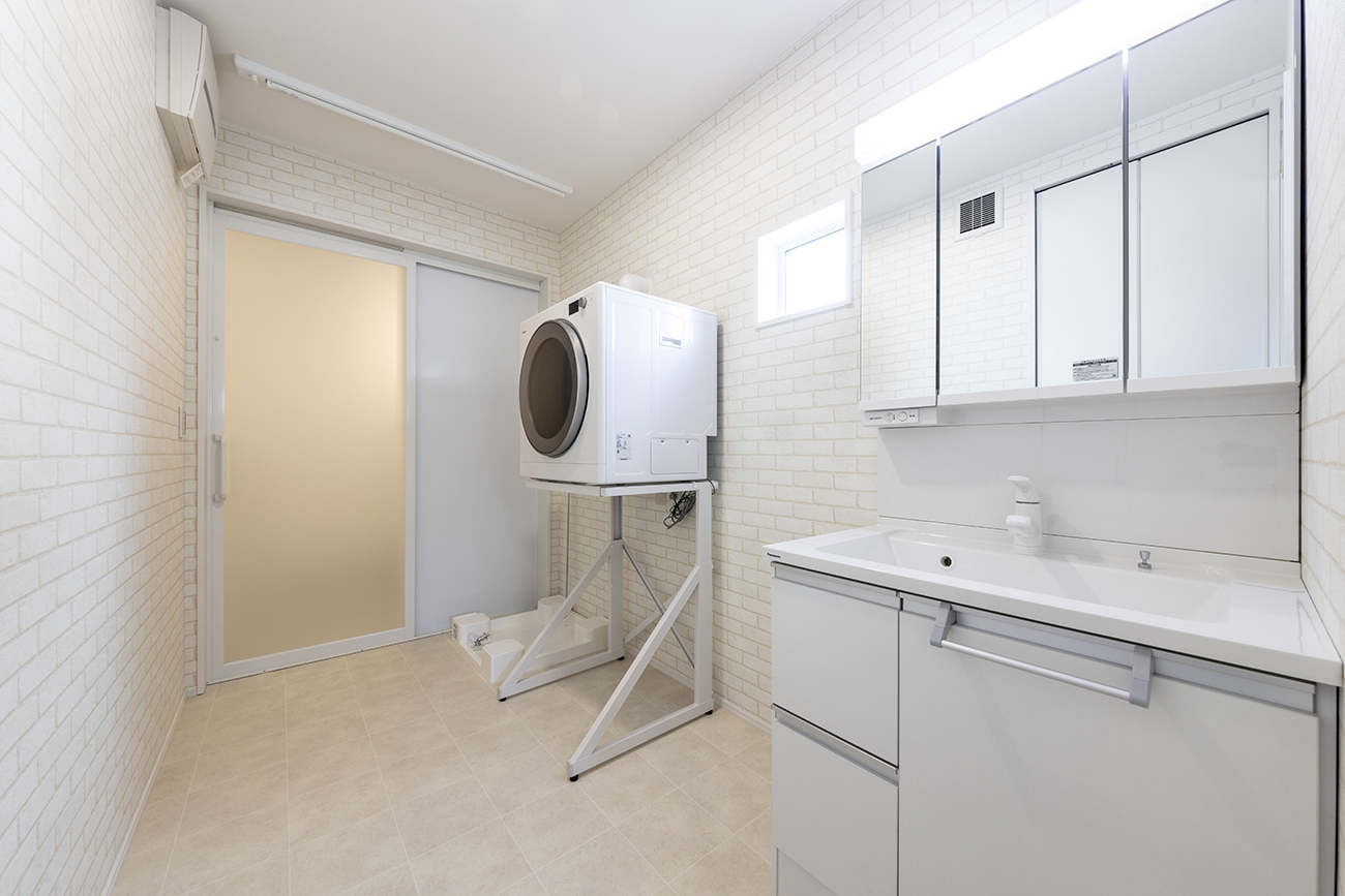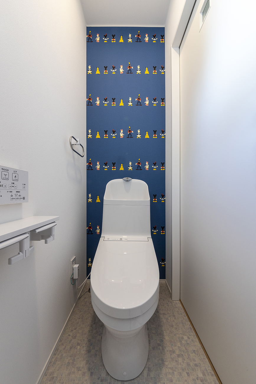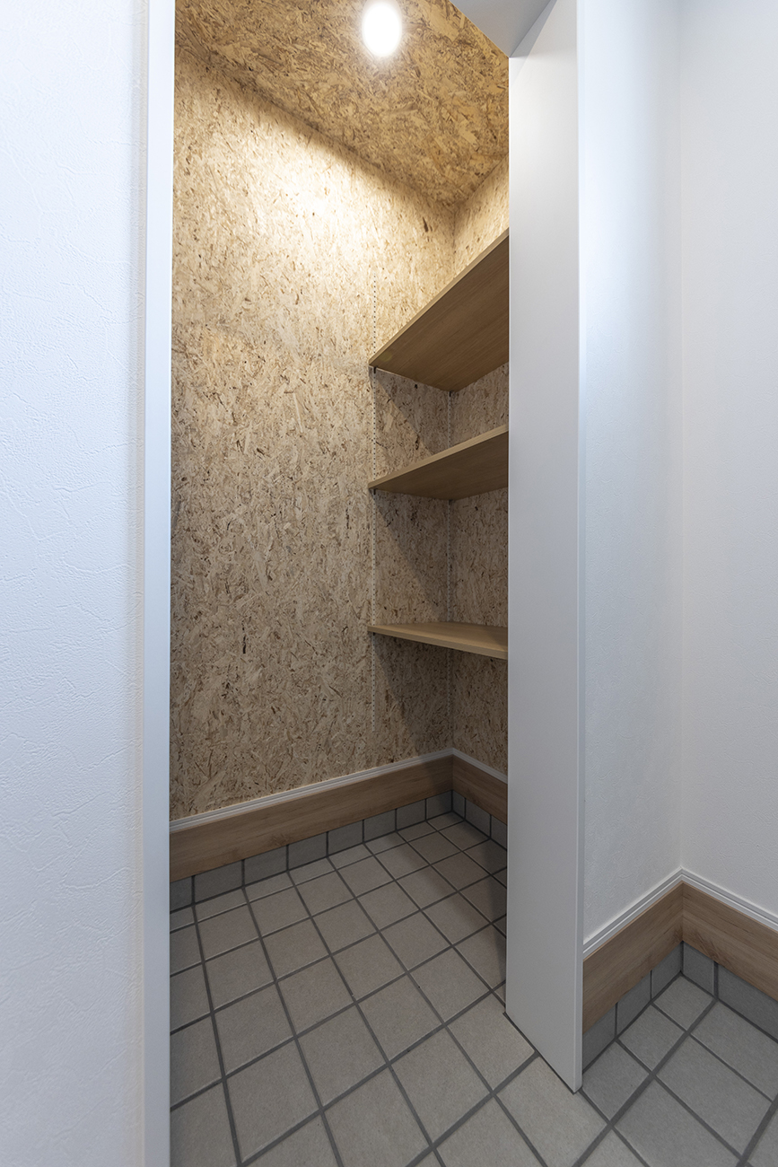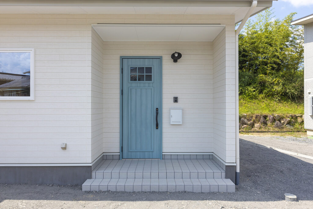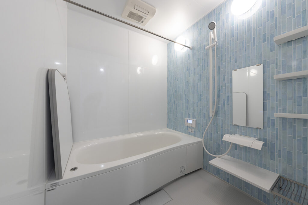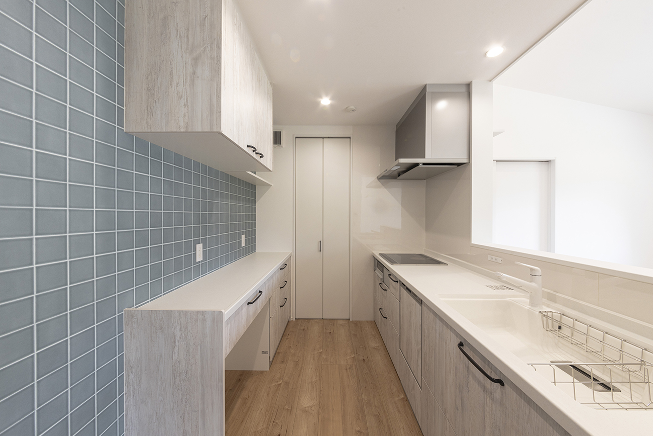 ブルーグレーのタイルが印象的な、清潔感あふれるキッチン。十分な収納と広い作業台で、毎日の調理が楽しくなります。