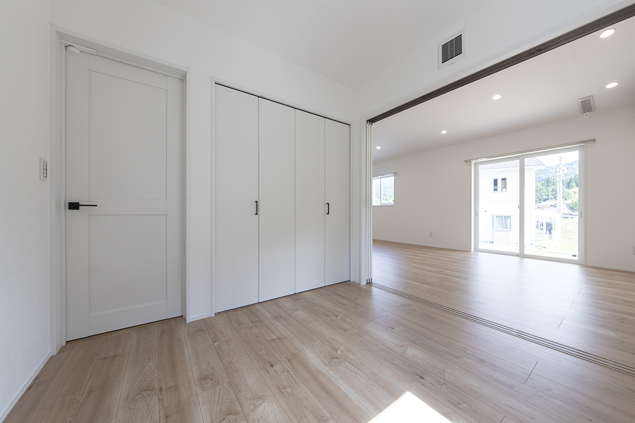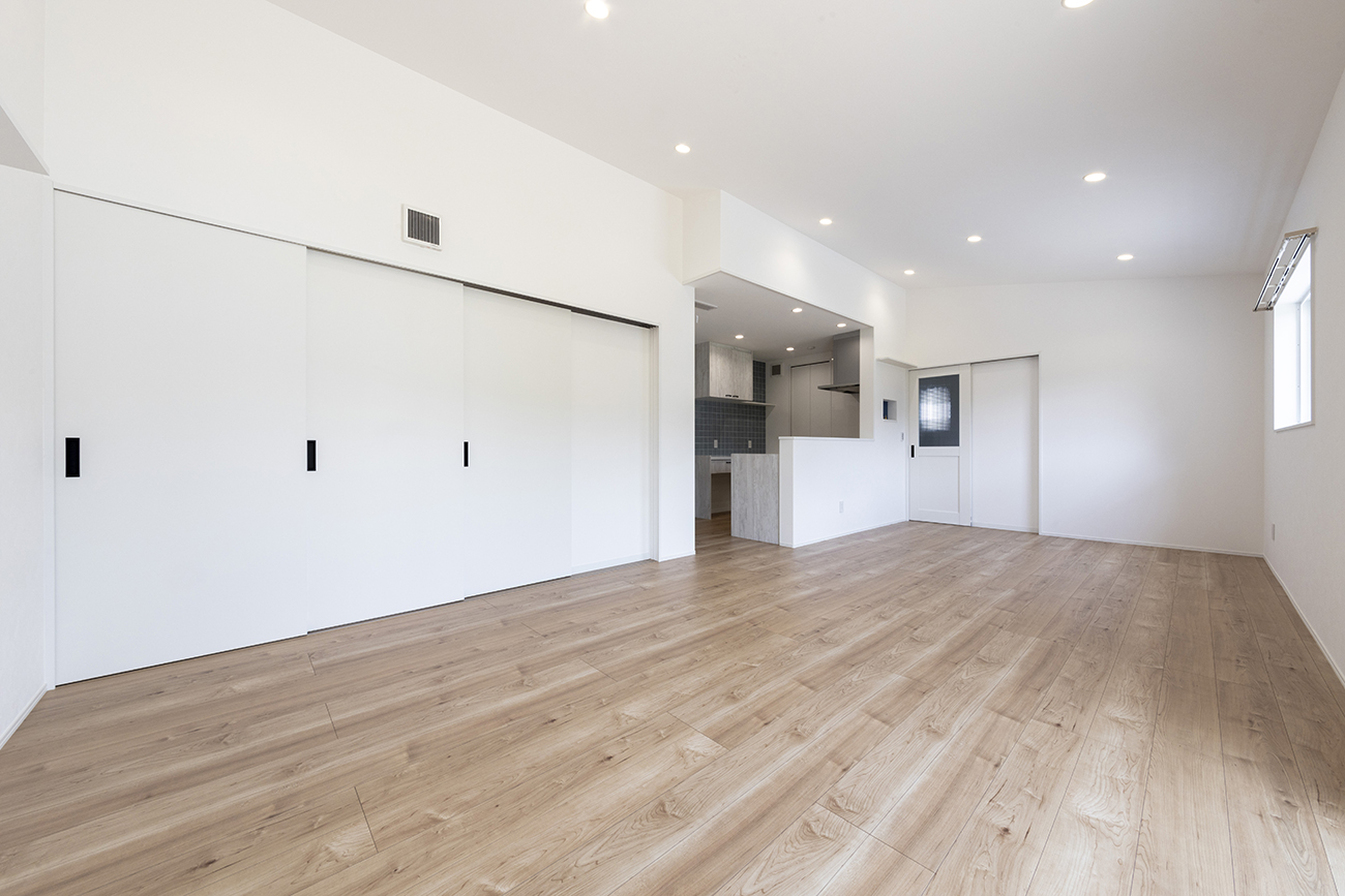 引戸で仕切れる洋室を備えたLDK。生活シーンに応じて空間を自在に変えられる設計です。