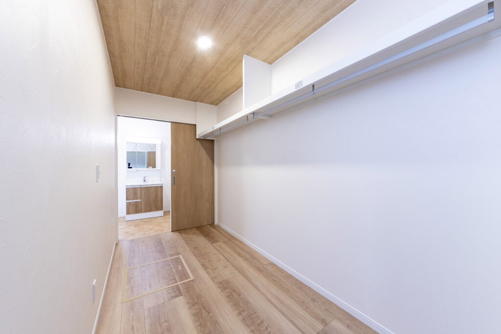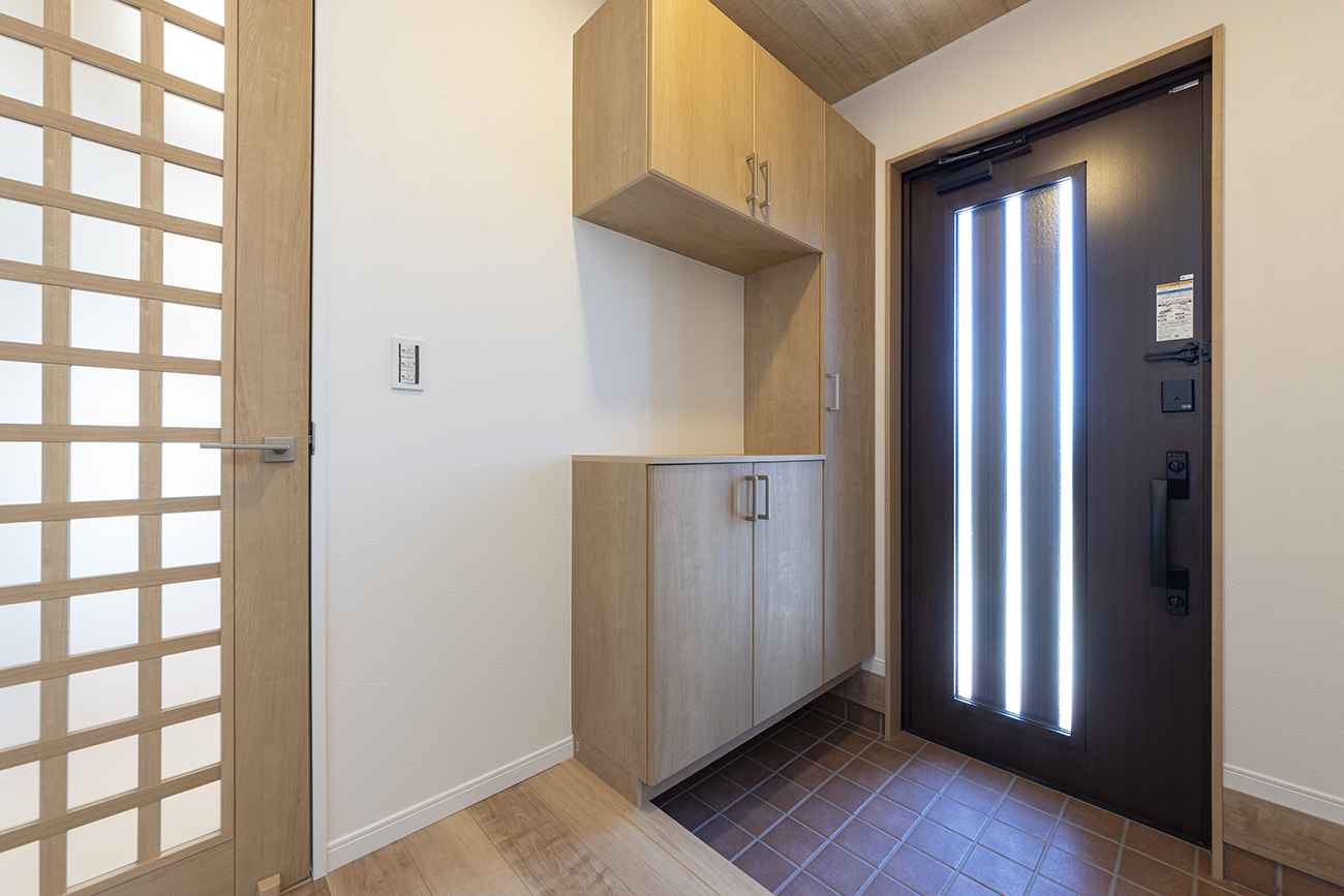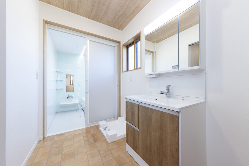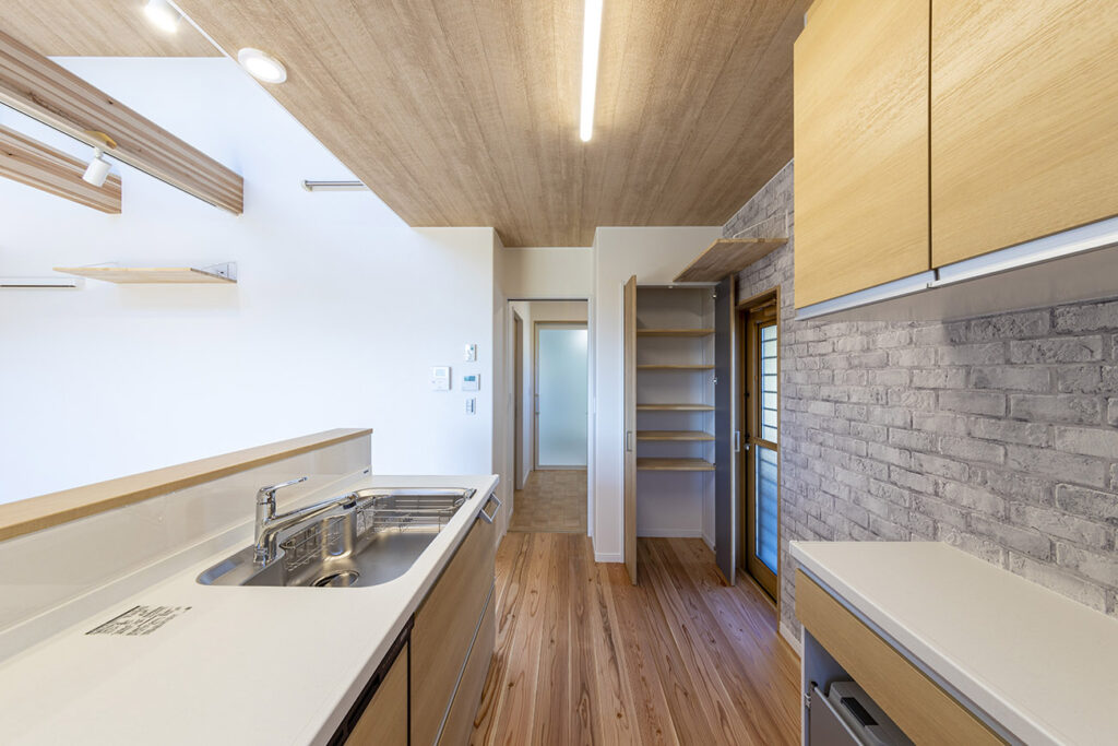 木目と白を基調にした明るいキッチン。背面収納も充実し、毎日の料理が楽しくなる機能的な空間です