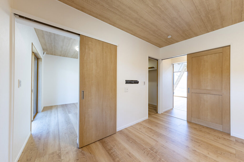 大開口から光が注ぐ、木の温もりに満ちたリビング。ロフト階段が空間に遊び心を添える、開放的な住まいです。