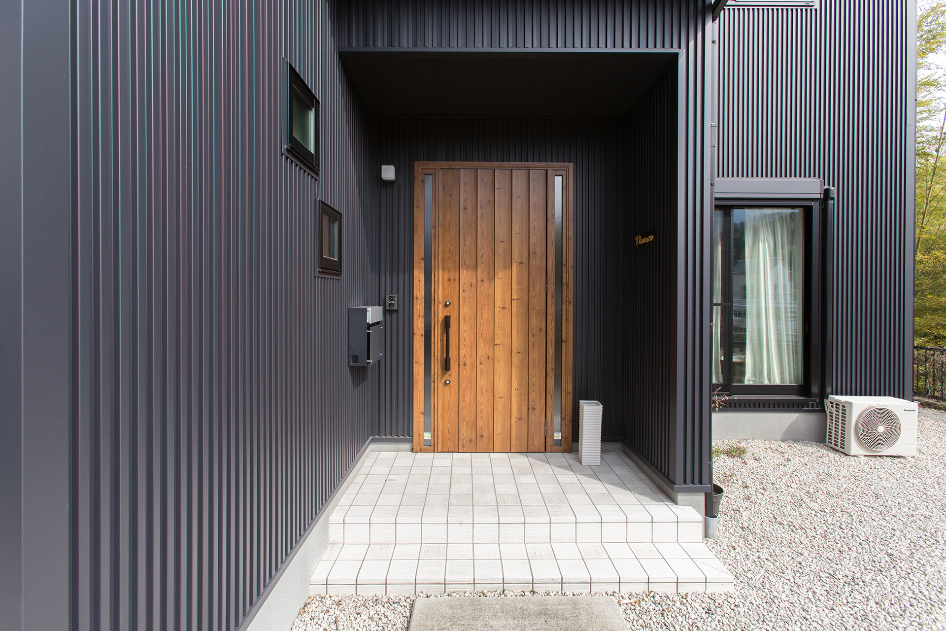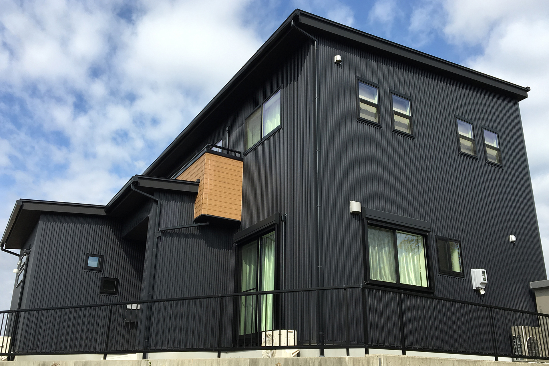 ブラックのガリバリウムに木目調の外壁がアクセント、シックすぎるお家