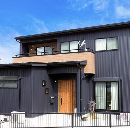 ブラックのガリバリウムに木目調の外壁がアクセント、シックすぎるお家