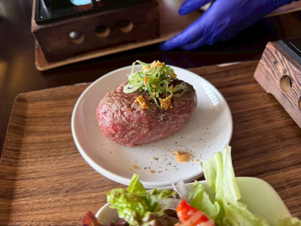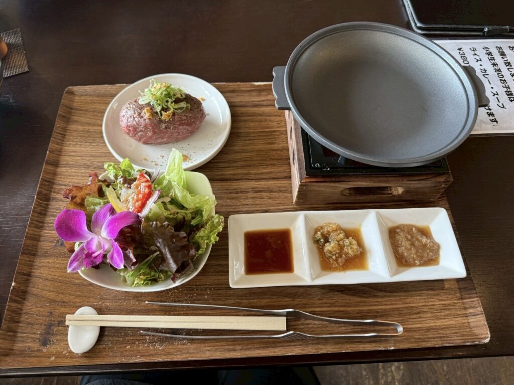 鉄板で飛騨牛100%レアハンバーグを自分好みに焼いて食べます