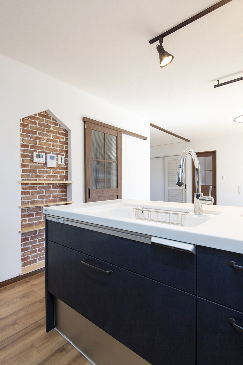 ・パントリーの入口とニッチの△型を合わせました。・ワンポイントでクロスの色を変えました。